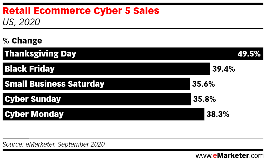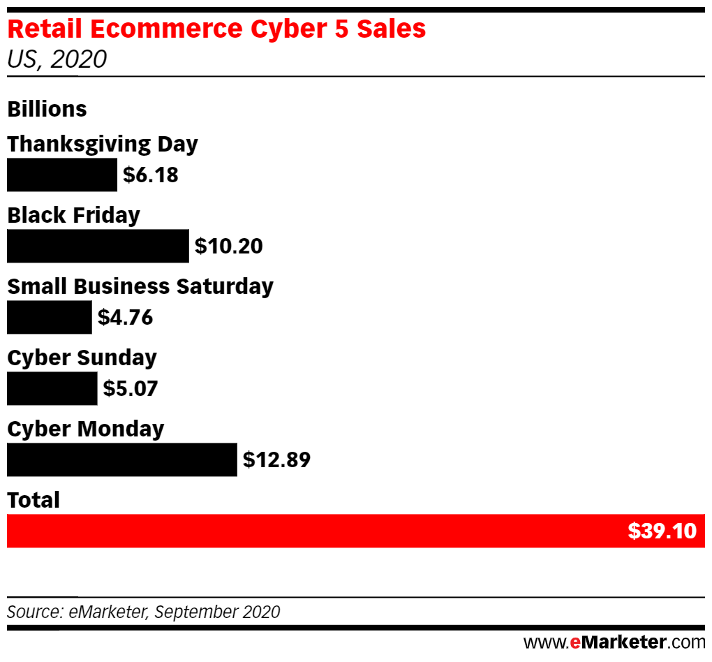 Of the five big online shopping days in 2020, eMarketer says Cyber Monday will again beat out Black Friday in terms of overall e-commerce sales, at $12.89 billion compared with Black Friday’s $10.20 billion. But Thanksgiving Day will see the most year-over-year growth in e-commerce sales, at 49.5%, followed by Black Friday, Small Business Saturday, Cyber Sunday and Cyber Monday.