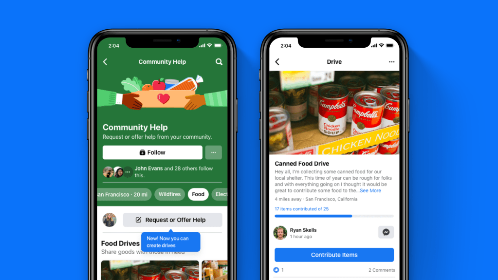 Facebook today is introducing a new feature that will allow users in the U.S. to collect food, clothing and other necessities for people in need. The feature, called “Drives,” is being made available through Facebook’s existing Community Help hub, which is the place where Facebook centralizes requests and offers for help within a local community.