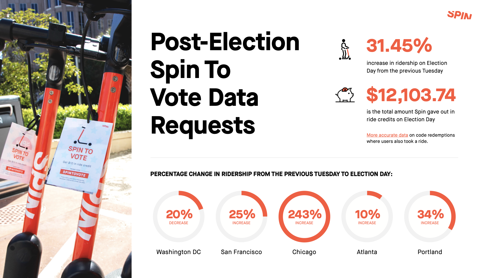 Cities with the highest increases in ridership on Election Day were Chicago, with a whopping 243% rise, Cleveland with 193%, San Francisco with 25% and Atlanta with a10% increase. Spin also tracked use of its Spin to Vote campaign. Riders in Atlanta, Baltimore, Chicago, Cleveland, San Diego and Washington, D.C. had the highest opt-in for that discounted ride campaign.