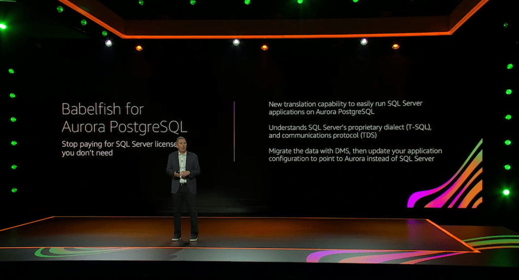 AWS today announced a new database product that is clearly meant to go after Microsoft’s SQL Server and make it easier — and cheaper — for SQL Server users to migrate to the AWS cloud. The new service is Babelfish for Aurora PostgreSQL. The tagline AWS CEO Andy Jassy used for this service in his re:Invent keynote today is probably telling: “Stop paying for SQL Server licenses you don’t need.” And to show how serious it is about this, the company is even open-sourcing the tool.