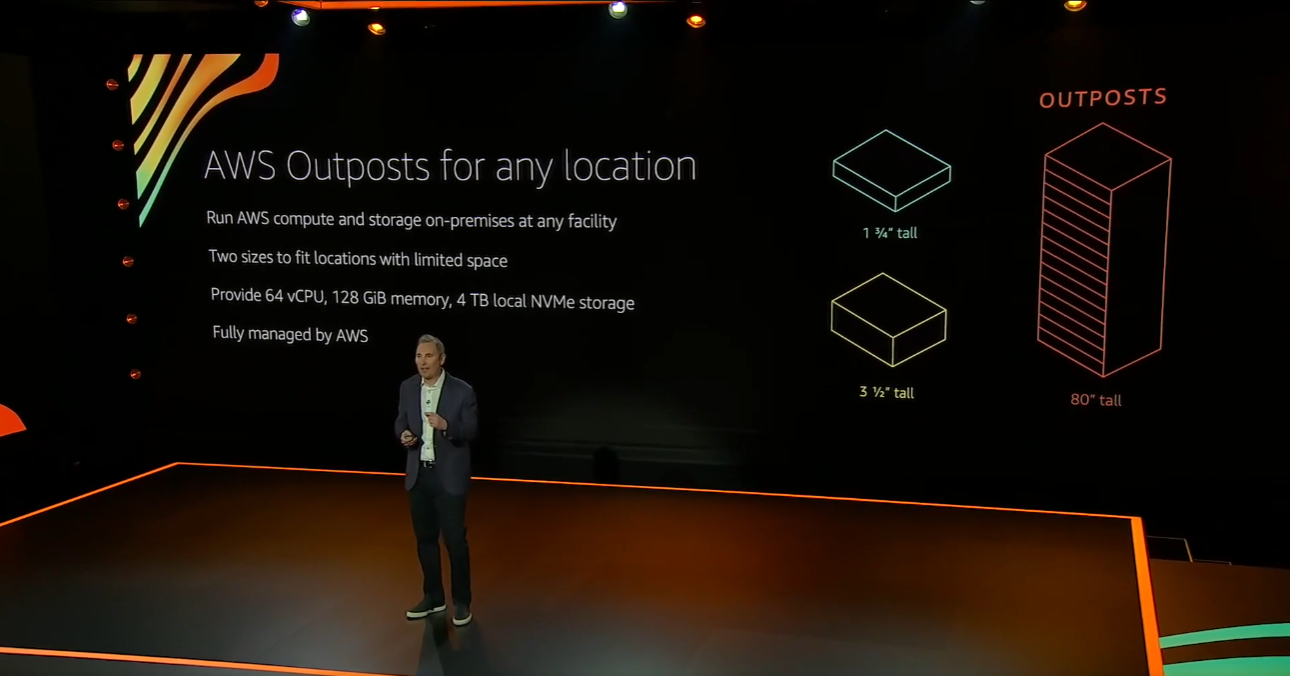 AWS today closed out its first re:Invent keynote with a focus on edge computing. The company launched two smaller appliances for its Outposts service, which originally brought AWS as a managed service and appliance right into its customers’ existing data centers in the form of a large rack. Now, the company is launching these smaller versions so that its users can also deploy them in their stores or office locations. These appliances are fully managed by AWS and offer 64 cores of compute, 128GB of memory and 4TB of local NVMe storage.