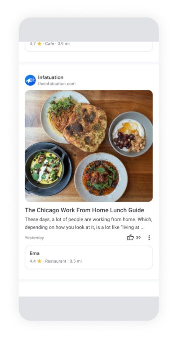 In addition to posts from businesses, the new Community Feed will feature content posted by Google users you follow as well as recent reviews from Google’s Local Guides — the volunteer program where users share their knowledge about local places in order to earn perks, such as profile badges, early access to Google features and more. Select publishers will participate in the Community Feed, too, including The Infatuation and other news sources from Google News, when relevant.