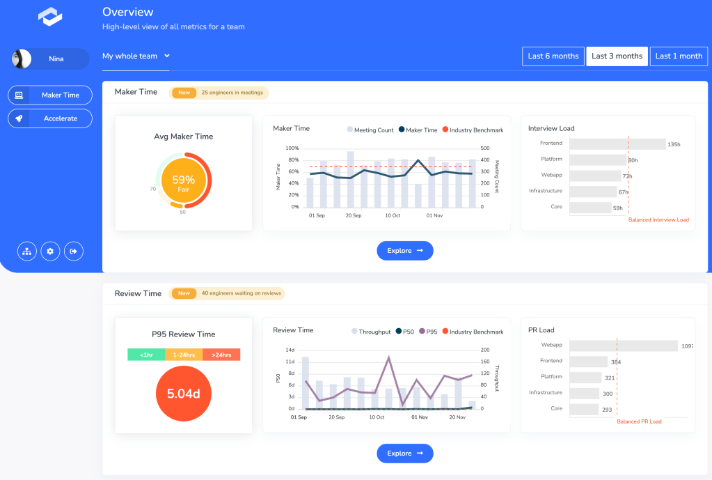 A large part of Okay’s sell seems to be ensuring that managers can keep an active eye on the common pitfalls of rapid scaling and keep them in check so they can keep direct-reports satisfied. On the individual basis, managers can quickly see stats related to how much of an individual manager’s time is being spent in meetings compared to uninterrupted “maker time” where they actually have the ability to get work done.