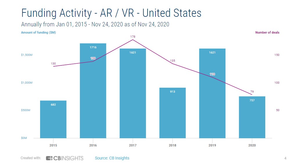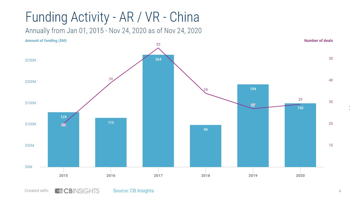 Though China still sees plentiful startups competing in AR and VR, the number getting funded has declined from the apex of the industry’s hype. In 2017, the Chinese AR and VR market saw 55 funding rounds and $264 million raised, according to data provided by research firm CB Insights. Year to date, there have only been 29 deals, which amount to $150 million in funding. Even prior to the pandemic that weakened the economy, the industry saw only 27 deals and $194 million raised in China during 2019.