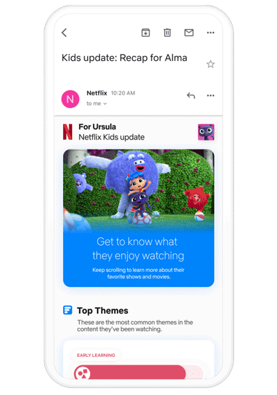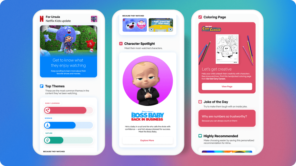 This includes information about the child’s recently watched shows and interests, as well as suggested conversation topics and activities — like coloring pages or jokes — that parents can use to engage kids further. This could help those families where parents may not be clued in as to how kids are spending their time on Netflix — like those where the kids often watch independently or on their own device, for example.