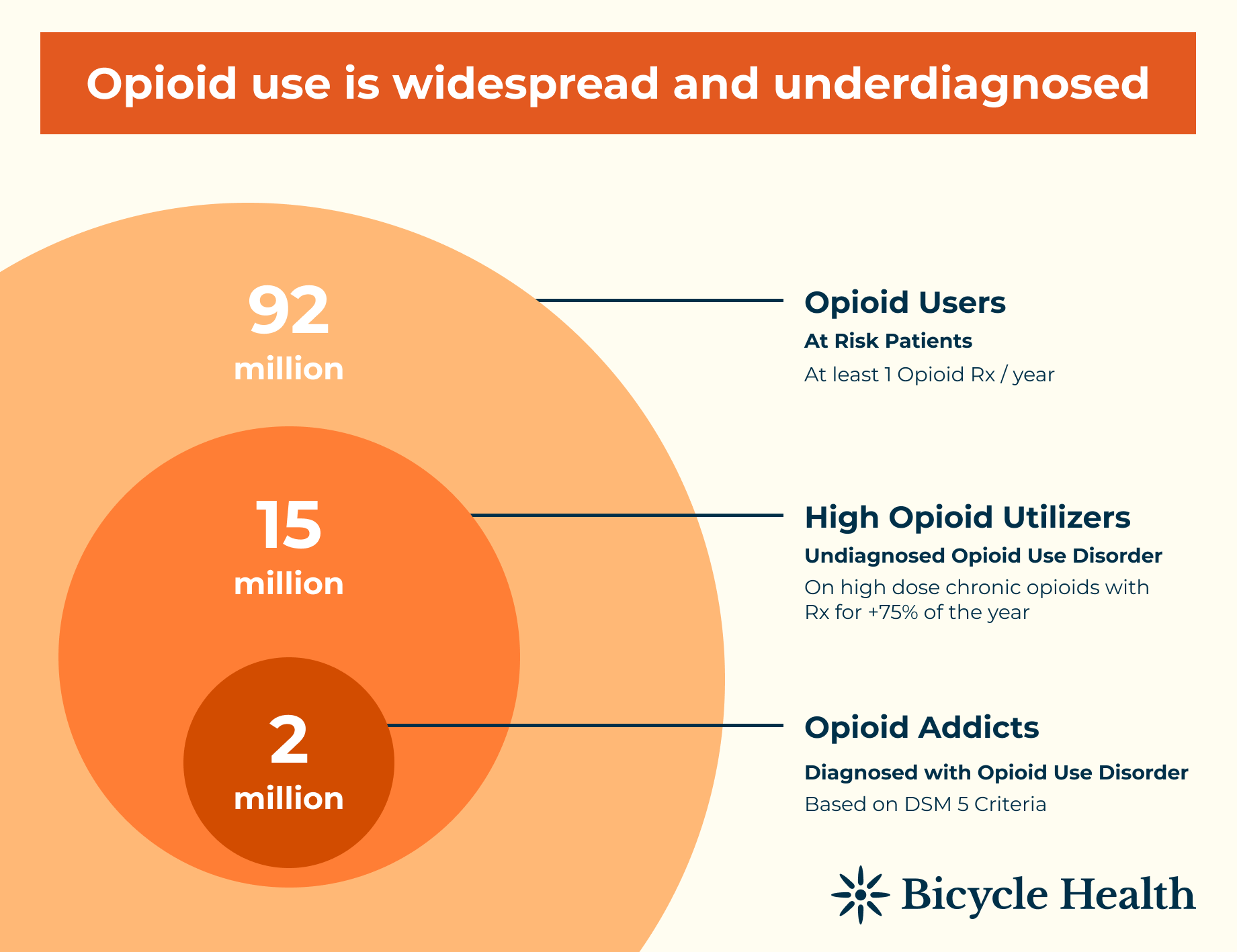 And the problem isn’t going away. Bicycle Health’s statistics indicate that 92 million Americans are potentially at risk for developing opioid use disorder, and 2 million Americans are already diagnosed as opioid addicts.