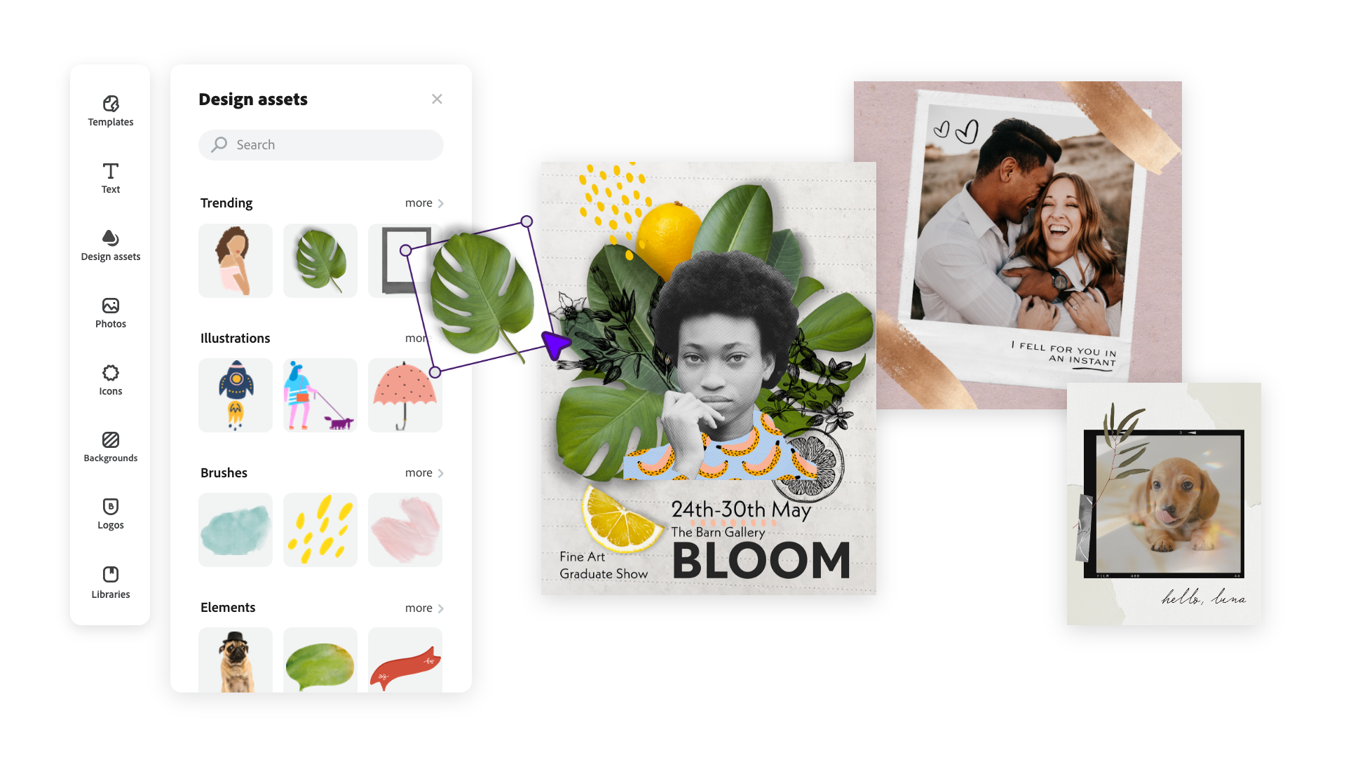 Adobe has a large in-house content design team that designed some of its own assets and curated others from outside resources. Those assets were all tagged, to make them discoverable, which now makes it easy to find them in Spark’s search feature. As of now, these results are not personalized yet — or set to match with what’s already in your current design — but the team is exploring how to use AI to help users find the right assets for their specific designs.