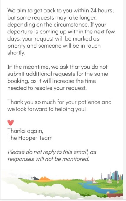 Customers may be expressing frustration over refunds, but they’re even angrier that they can’t get in touch with anyone. And Hopper didn’t necessarily do itself any favors here by sending out emails which said it was aiming to get back to customers within 24 hours — an entirely unrealistic promise (see below).