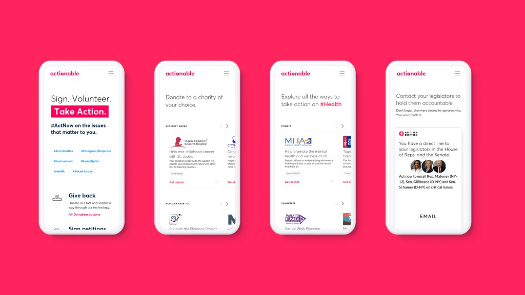 Skip forward to today, and people have become far more proactive about the causes they care about. That’s why Hewson is launching a new product called actionable, a library of actions mapped across dozens of causes, giving the user a clear view into how they can do something about the things they care about most.