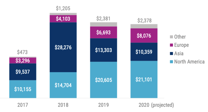 The 2018 data includes that huge, $14 billion Ant Financial round. This means we can mentally deduct $14 billion from Asia’s total for that year. But even with that bit of math, we can see regular declines in Asian fintech venture capital results since 2018.
