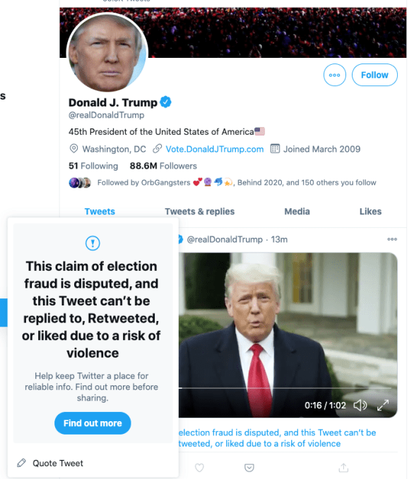 Twitter has previously hidden the president’s rule-breaking tweets, affixed them with small warning labels and limited their engagement, but the large pop-up is a tool we hadn’t yet seen the company use. Twitter said today that it would “[explore] other escalated enforcement actions” in light of the situation unfolding at the Capitol. It’s not clear if the pop-up is appearing for all users and we’ve asked the company if this was one of the escalated measures it referred to.