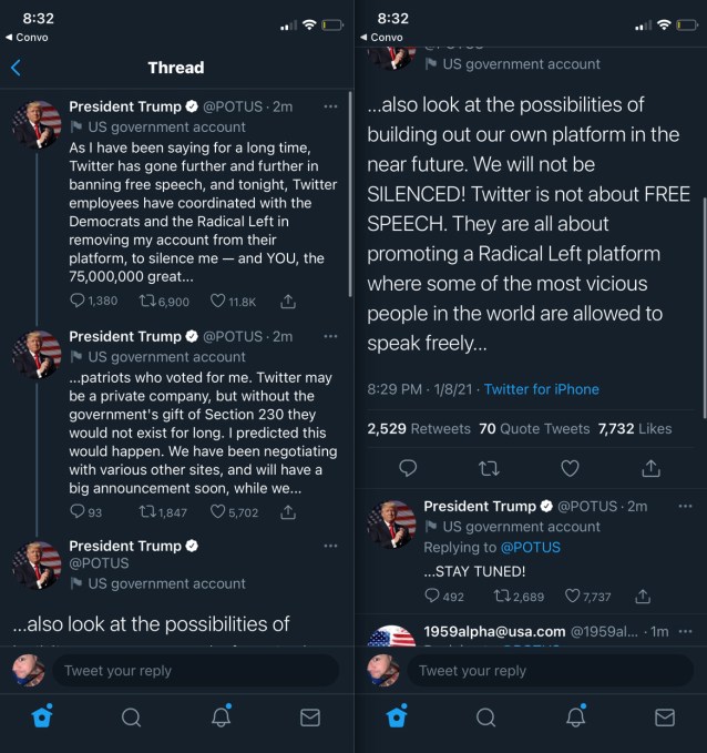 “We have been negotiating with various other sites, and will have a big announcement soon, while we also look at the possibilities of building out our own platform in the near future,” other tweets from the @POTUS account read in part.