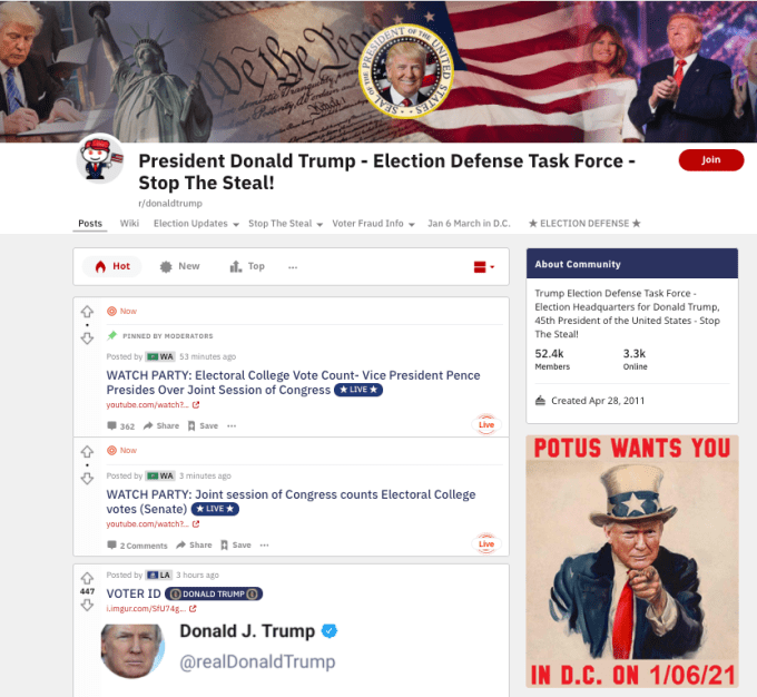 While r/donaldtrump didn’t approach the infamy of some other pro-Trump subreddits, the site was a current hub for the Stop the Steal movement. The subreddit also encouraged people to attend the D.C. rally that turned into deadly violence at the Capitol: A side banner on r/donaldtrump showed an image of President Trump as Uncle Sam. “POTUS wants you in D.C. on 1/06/21” it read.