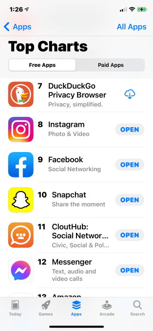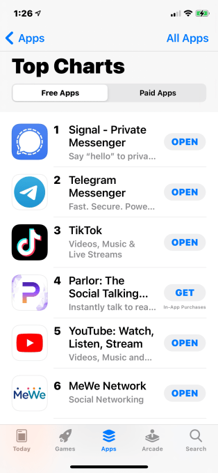 These apps have also picked up steam over the past week. Signal is now No. 1 on the U.S. App Store, Telegram is No. 2 and DuckDuckGo is No. 8. This is rapid growth. Around mid-October 2020, these apps were ranked No. 618, 79, and 715, respectively, Apptopia says. DuckDuckGo also told us it’s seen 62% year-over-year growth between 2019 and 2020 and has become the No. 2 search engine in the U.S., U.K., Canada and Australia.