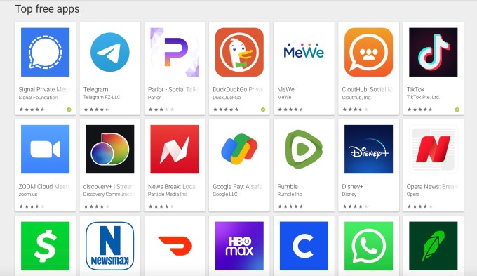 Then there is Rumble, a conservative alternative to YouTube. The app has gained 2.4 million total global installs since its January 2020 launch, per Apptopia’s estimates. Since Wednesday, that included 91,916 new downloads, 73,700+ of which were in the U.S. It has also climbed to No. 78 on the U.S. App Store, up from No. 1,484 on December 19, 2020.