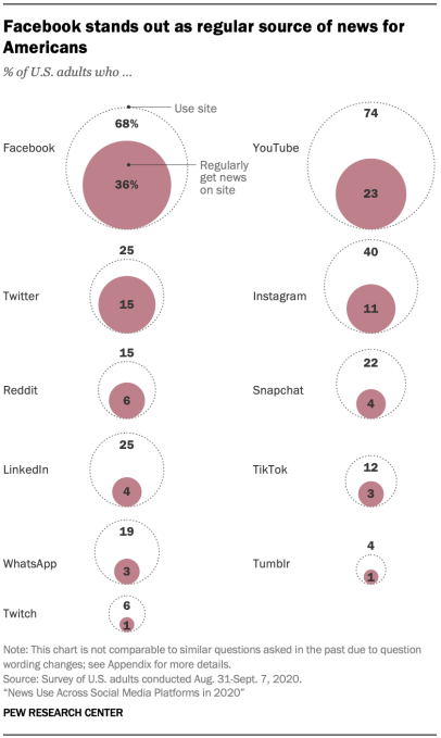 The study found that 36% of U.S. adults said they “regularly” access Facebook to get news. This is a significantly larger percentage than almost any other social media platform, with the exception of YouTube, which is used regularly for news by 23% of U.S. adults.
