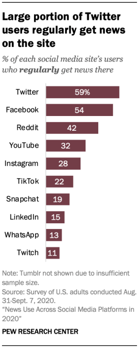 But even if their audiences are smaller, the site’s users may be heavily engaged with the news. Twitter, for instance, is used only by 25% of U.S. adults, but over half the users (59%) say they get news on the platform, compared with 54% of Facebook users. Meanwhile, 42% of Reddit users get news regularly on its site, even though it has a significantly smaller user base than Facebook.