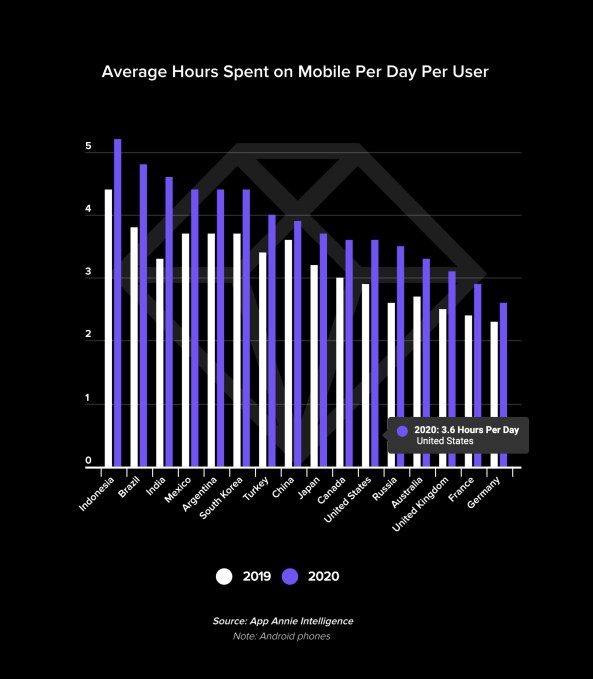 The increase in time spent is a trend that’s not unique to the U.S., but can be seen across several other countries, including both developing mobile markets like Indonesia, Brazil and India, as well as places like China, Japan, South Korea, the U.K., Germany, France and others.