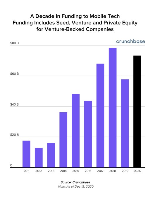 Investors were also eager to fuel mobile businesses as a result, pouring $73 billion in capital into mobile companies — a figure that’s up 27% year-over-year. According to Crunchbase data, 26% of total global funding dollars in 2020 went to businesses that included a mobile solution.