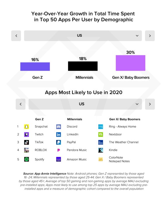 The trend isn’t isolated to any one demographic, either, but is seen across age groups. In the U.S., for example, Gen Z, millennials and Gen X/Baby Boomers spent 16%, 18% and 30% more time in their most-used apps year-over-year, respectively. However, what those favorite apps looked like was very different.