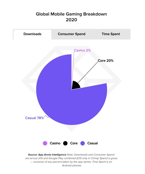 Mobile gaming adoption also continued to grow in 2020. Casual games dominated the market in terms of downloads (78%), but Core games accounted for 66% of games’ consumer spend and 55% of the time spent.