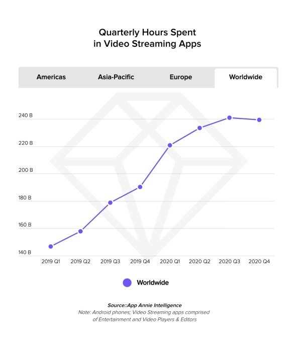 Other video services boomed in 2020, thanks to a combination of new market entrants and a lot of time spent at home. Consumers spent 40% more hours streaming on mobile devices, with time spent in streaming apps peaking in the second quarter in the west as the pandemic forced people inside.