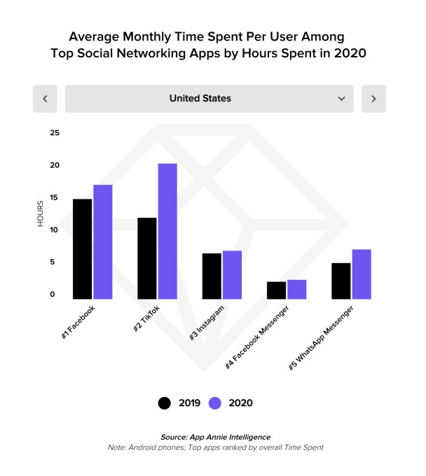 The app saw incredible 325% year-over-year growth, despite a ban in India, and ranked in the top five apps by time spent. The average monthly time spent per user also grew faster than nearly every other app analyzed, including 65% in the U.S. and 80% in the U.K., surpassing Facebook. TikTok is now on track to hit 1.2 billion active users in 2021, App Annie forecasts.