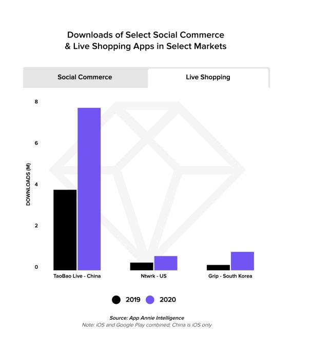 Livestreaming shopping grew, too, led by China. Downloads of live shopping TaoBao Live in China, Grip in South Korea and NTWRK in the U.S. grew 100%, 245% and 85%, respectively. NTWRK doubled in size last year, and now others are entering the space as well — including TikTok, to some extent.
