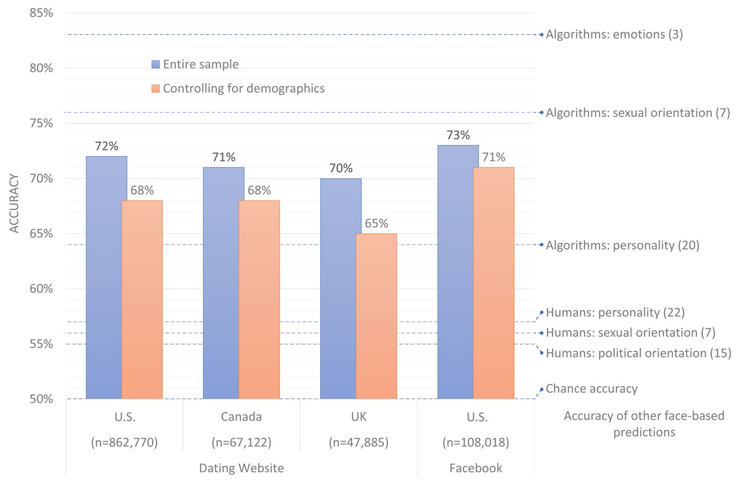 The most obvious way of addressing this is by having the system make guesses as to the political party of people of the same age, gender and ethnicity. The test involved being presented with two faces, one of each party, and guessing which was which. Obviously chance accuracy is 50%. Humans aren’t very good at this task, performing only slightly above chance, about 55% accurate.