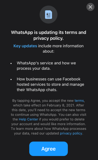 In recent weeks WhatsApp has been alerting users they must accept new T&Cs in order to keep using the service after February 8.
