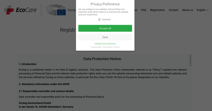 Specifically, the EcoCare COVID-19 testing-registration website was found to drop a cookie from the U.S.-based company Stripe, as well as including many more third-party requests from Google and Stripe.