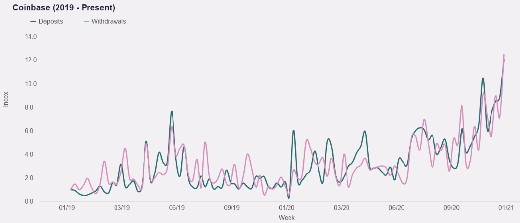 They are scaling rapidly. Using the first week of January 2019 as a baseline, by the last week of December 2020 deposits and withdrawals from Coinbase had grown by more than 12x apiece. That’s staggering growth, and while the data is somewhat volatile — and we’d treat it as directional instead of exact — on a week-to-week basis, it underscores how well companies like Coinbase may be performing as Bitcoin booms once again, bringing in more trading interest and consumer demand.