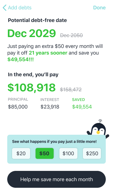The app then calculates how long it would take to pay off this debt if you only made minimum payments. This number helps shock people into action, as they’ll often discover they’re going to be in debt for another 40 or 50 years.