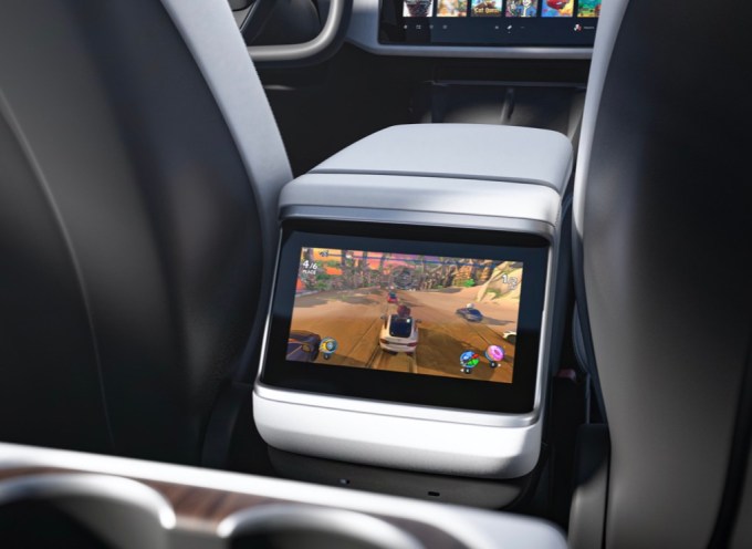 In addition to the 12.3″ driver display above the steering yoke, there’s also now an 8″ display in the rear (presumably so passengers can more easily play the car’s built-in games in the back, as displayed.)