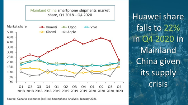 Overall, smartphone shipments in China fell 11% to about 330 million units in 2020, with market recovery hindered by Huawei’s inability to ship new units. Even though demand in China for Huawei devices remains high, the company has struggled to cope with sanctions imposed by the U.S. government under the Trump administration that banned it from doing business with American companies and drastically curtailed its ability to procure new chips.