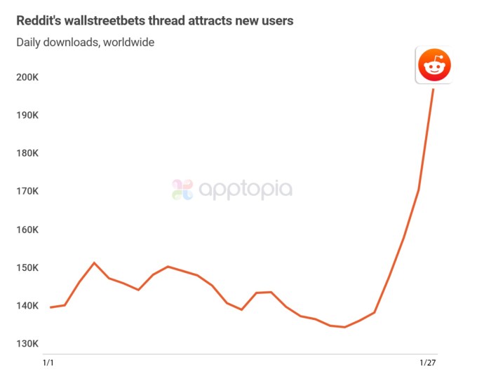 Meanwhile, online forum site Reddit broke its download record for its mobile app, with 199,000 single-day downloads on iOS and Android, Apptopia estimates, while also climbing to No. 2 on the Overall Top Charts on the U.S. App Store.