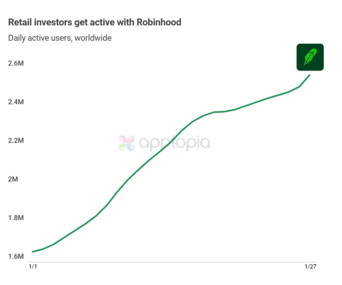 The app store intelligence firm also found that Robinhood had its best day ever in terms of single-day downloads on Wednesday, Jan. 27, 2021 when 120,000 new users downloaded the stocks app for the first time across both iOS and Android. Robinhood also broke records for its highest number of daily active users on mobile at 2.6 million.