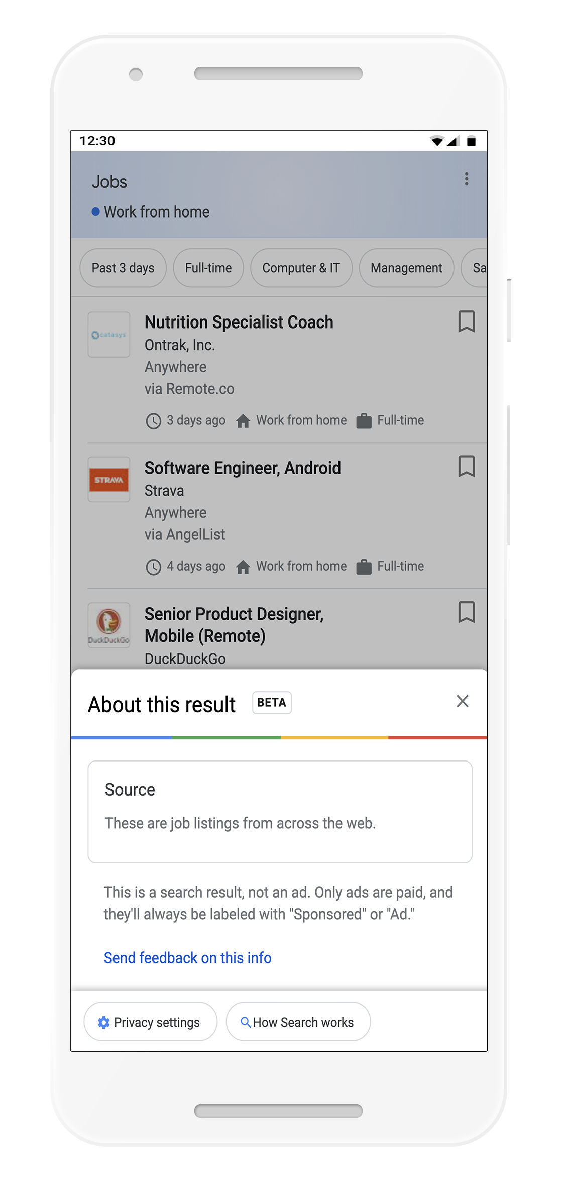 There’s also a full link and a short line about whether it’s a native search result or an ad (which seems like a tacit admission that it’s too hard to distinguish ads from regular search results on Google). At the bottom of the pane, there are also links to your privacy settings and to an explainer about “how search works.”