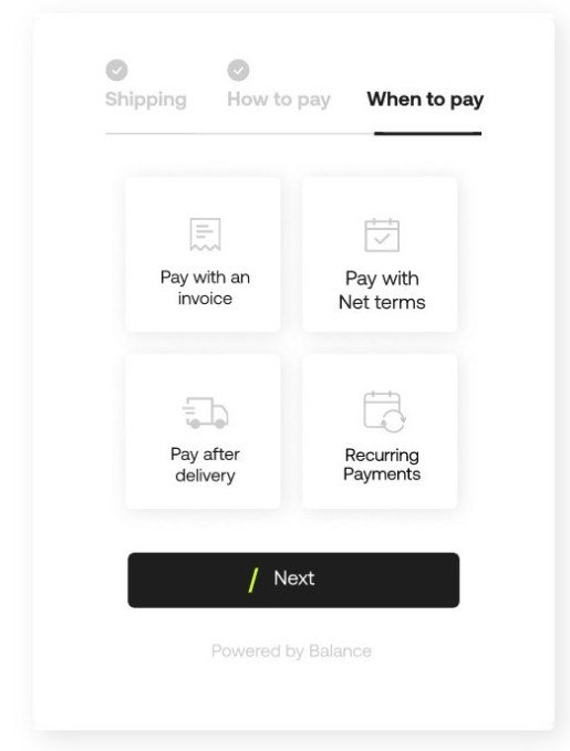 Balance offers efficient B2B payments that allows merchants to offer a variety of payment methods including ACH and bank wires as well as a variety of payment terms including payment on delivery, net payment terms, and payment by milestone. Behind the scenes, Balance underwrites the terms of those transactions requiring financing by evaluating the risk of the customer, the merchant and the specific payment terms selected. Balance is built on top of Stripe and offers all of Stripe’s credit card payment options, but then extends far beyond them.