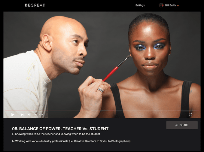 When BeGreatTV launches in a couple of months (the plan is to launch in April), the platform will feature at least 10 courses — each with around 15 episodes — focused on arts, entertainment, beauty and more. At launch, courses will be available from Sir John, a celebrity makeup artist for L’Oréal and Beyoncé’s personal makeup artist, BeGreatTV co-founder Cortez Bryant, who was also Lil Wayne and Drake’s manager, as well as Law Roach, Zendaya’s stylist.