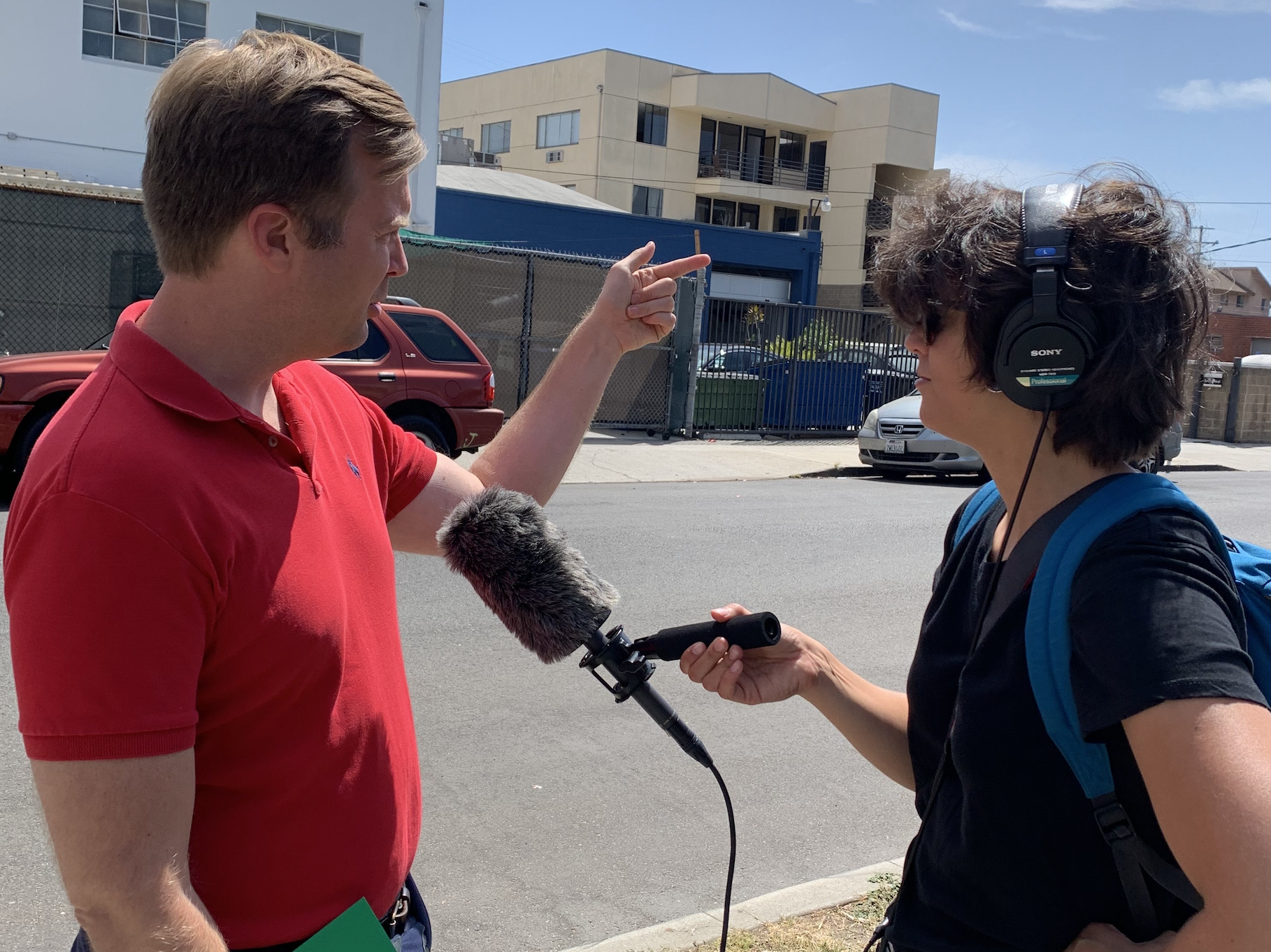 For in-person interviews not recorded in Pineapple’s Brooklyn studio, my basic reporting kit includes a Zoom H5, which has two XLR channels and allows me to give one Rode NTG-2 shotgun mic to the host Natalia and the other to the interviewee. (On mic stands, of course — the mic itself is prone to handling noise.) I’ve got a Rode pistol grip for when we, say, knock on doors in the neighborhood of the former Chippendales club in LA, looking for people who had been around when the party scene at the club was supposedly causing wars between the owners, neighbors and the police. (Luckily, we found Naomi, 94, who had been there since 1972 and had stories for days. She’s in the podcast.) Christine showed me how she brilliantly uses a cross-body camera strap attached to her recorder so she can hang it comfortably around her. For gear bags I used to swear by the Lowepro Passport Sling, but now that I’m older (lol), one-strapping isn’t comfortable for a long day in the field, so I use a regular backpack. My kit also includes Sony MDR-7506 headphones, an assortment of three- and six-foot XLR cables (always have backups), a deadcat, extra SD cards, an Electro Voice RE50/B mic, pens, snacks, release forms and batteries. So many batteries.