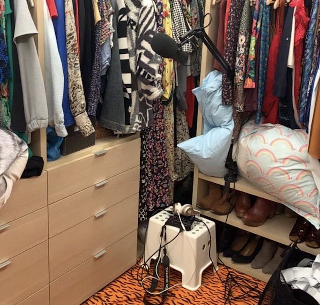 Then the pandemic hit. We all went on lockdown. We had done most of our interviews but there were a few we still needed, plus all the host tracking for the series. So we shipped Natalia a kit: a Zoom H6, a Shure SM7B cardioid dynamic announcer microphone, a CloudLifter CL-1 Microphone Activator, a broadcast arm, XLR cables and a windscreen. Natalia set up shop in her closet, surrounded by clothes, a fleece blanket on the floor, and as many cushions as she was willing to pull off her couches and chairs. (Sound bounces off of hard surfaces. The soft materials absorb it so the recordings won’t sound echoey or “roomy.”) We sent our amazing engineer Hannis Brown mic tests so he could diagnose the set-up from afar and suggest tweaks. And Natalia, bless her, was incredibly game to essentially become her own recording engineer ON TOP OF hosting an entire show. We quickly got accustomed to doing everything remotely and over Zoom, as all of us everywhere did.