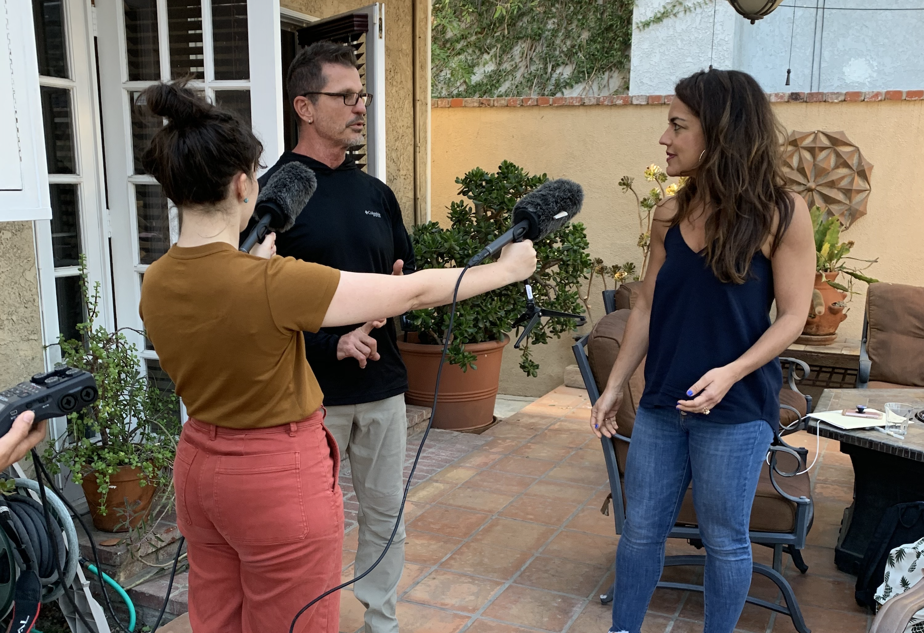 When it came to remote interviewing, we would connect over Zoom, and both Natalia and our interviewee would record themselves. (We always recorded the Zoom as a backup too.) It was up to us producers to talk our interviewees through self-syncing. Experience and teamwork was of the utmost importance here. Interviewees only had so much time, and explaining how to set up a recording on a smartphone (or iPod!, yes, really) and transfer a test recording quickly, and then troubleshooting any audio problems in their location was important to getting a high-quality interview without taxing anyone’s patience. There are several useful guides and graphics out there that walk through the set-up. There’s something a little bit lost, of course, when we don’t get to walk into people’s homes for interviews, or even when former Chippendales dancers can’t produce their original costume in the middle of the interview — as one guy did. But everyone was incredibly kind and patient and willing to do this for us, for which we are very, very grateful.