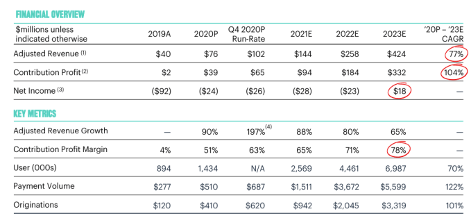 To get there the company’s growth needs to keep up with payment volume — MoneyLion expects to generate 17% of revenue in 2023 from payments, it notes on page 31 of its deck — rising sharply along with loan originations. Total expenses at MoneyLion fell from $127 million in 2019 to $99 million in 2020; that gain helped reduce its net losses, but the company may have to spend more on travel and marketing in the future. If so, that could make it a bit harder to reach break-even status.
