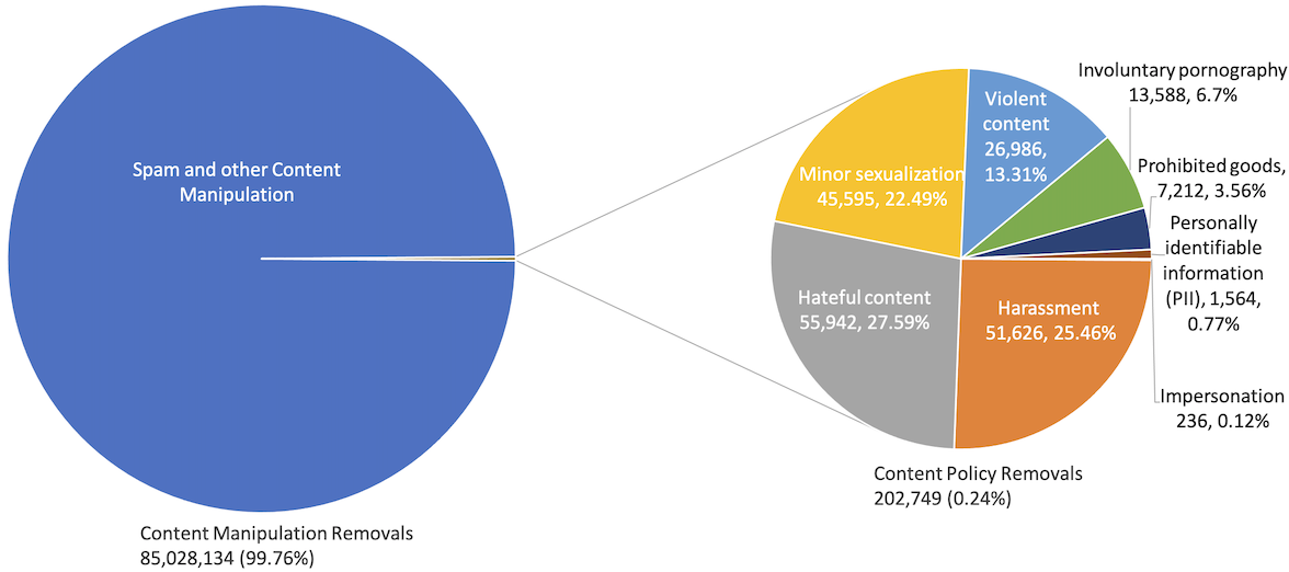 The remaining 85 million were taken down by Reddit admins; 99.76% of these were spam or “content manipulation” like brigading and astroturfing, with around 50,000 each of harassment, hate and sexualization of minors, smaller amounts of violent speech, doxing and so on.