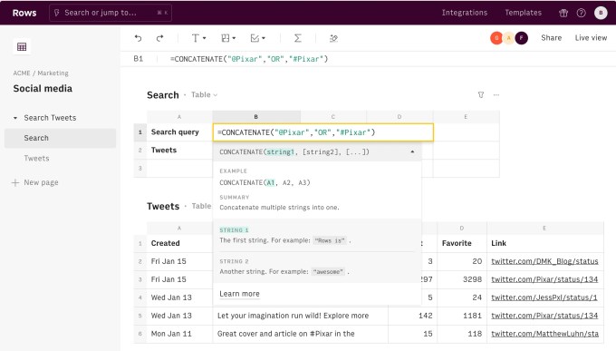 You might ask, why is it more useful, for example, to look at content from Twitter in Rows rather than Twitter itself? A Rows document might let a person search for a set of Tweets using a certain chain of keywords, and then organise those results based on parameters such as how many “likes” those Tweets received.