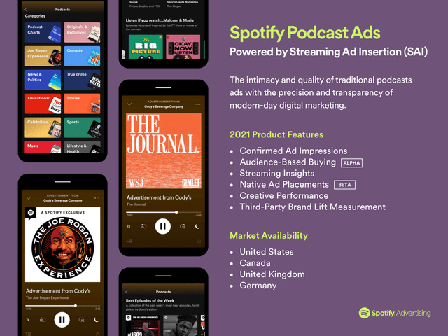 Spotify today also spoke about how its recent acquisition of Megaphone would allow it to scale its Streaming Ad Insertion (SAI) technology, launched in early 2020, to publishers beyond its own Originals and Exclusives audio programs. Today, SAI is available in the U.S., Canada, Germany and the U.K., and will expand to other new markets in 2021.