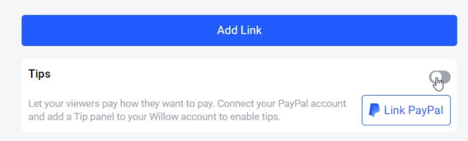 To do so, you’ll just toggle on the Tips feature from the website builder interface and then connect your PayPal account to Willow. This places a “Donate!” button at the top of your link list, so you can encourage fans to leave a tip.