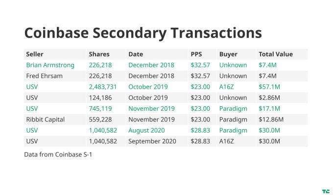 What’s interesting is not just that USV in particular is selling a large part of its holdings, but also the price they were willing to sell at. According to Coinbase’s filing, USV sold 3.35 million shares at $23 per share in late 2019, and later sold about 2 million shares at $28.83 per share in mid-2020.