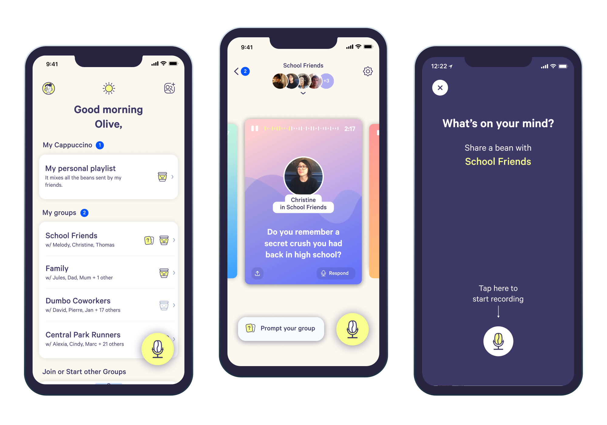 This is where Cappuccino fits. The app lets you create groups with your friends or your families. Members of the group can record a short audio message — a bean, as the startup calls it. They talk about what’s on their mind for a couple of minutes. The next morning, group members receive a notification saying that your morning cappuccino has been brewed.